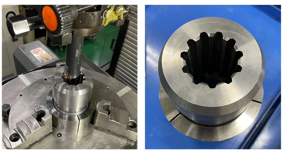 小原歯車工業は内径インボリュートスプラインの加工において、ハイス・ピニオンカッターによる加工時間を短縮できないかと考えていた。1個のワークを加工するのに120分かかり、さらに製品4個毎に工具寿命を迎えハイス工具の再研磨も行い、再研磨には1回30分かかっていた。1ロット10本のため3回の再研磨をし、工具費だけではなく再研磨費用もかかってしまっていた。