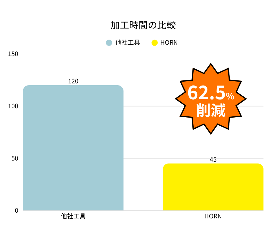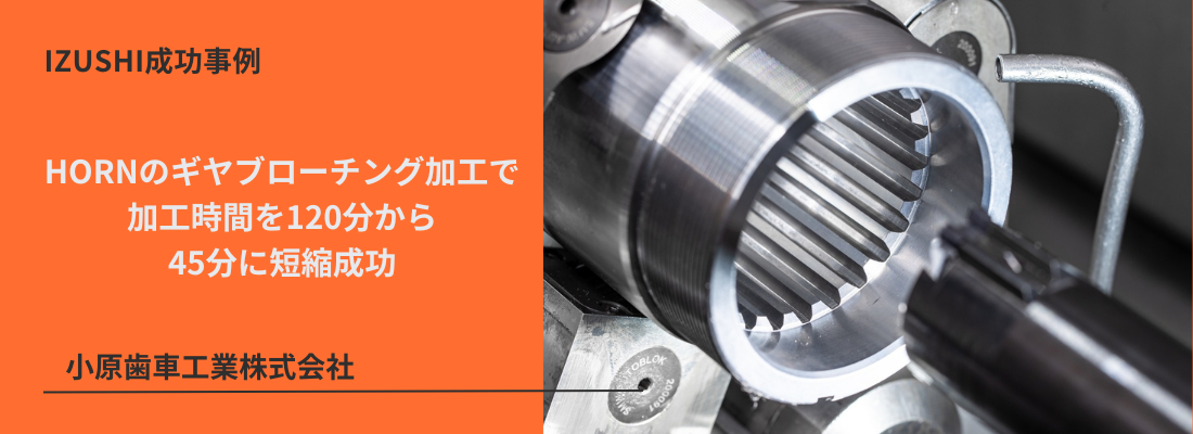 HORNのギアブローチングを導入したところ、1ロット10個の加工に3日かかっていたところが1日で完結するようになり、大幅な加工時間の短縮、および手間の削減が可能になった。加えて工具費も35%削減することができた。そして1個あたり120分の加工時間を45分に短縮することができた。